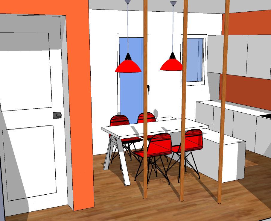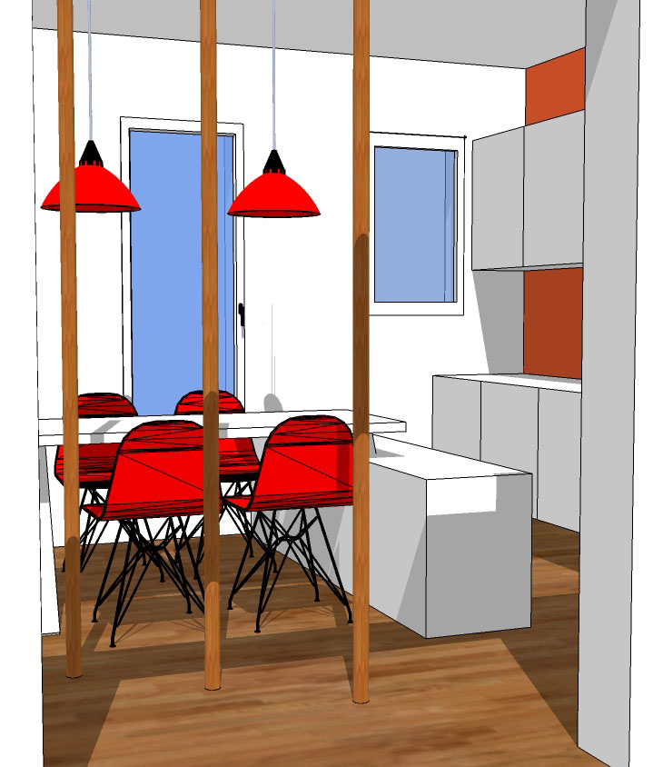 La cuisine existante et la pièce servant de débarras sont réunis et cette nouvelle cuisine/ salle à manger est ouverte sur l’entrée. La séparation entre les 2 pièces est faite par des bambous de 3m de haut.