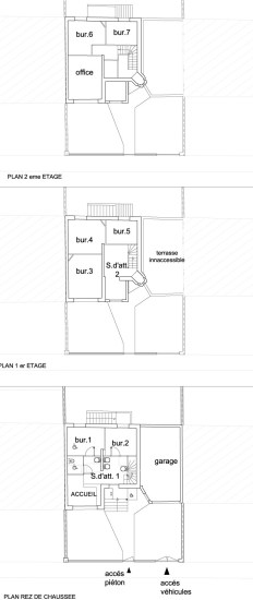 Le bâtiment s’élève sur 3 niveaux de bureaux médicaux avec un sous-sol semi enterré non utilisé et un garage de plein pied servant de stockage. La maison s’enroule autour de l’escalier non prévu pour un usage de réception du public.