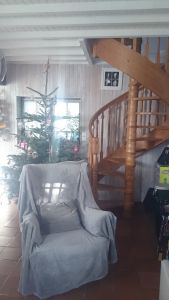 Cette maison ancienne de village à rez de chaussée et comble habitable est le fruit de l’association de 2 petites maisons accolées. Elle a gardé son histoire de maisons jumelées par la présence de ses deux accès indépendants desservant l’étage. Un escalier en colimaçon donne directement du beau séjour dans la grande chambre parentale aux fermes apparentes. Une échelle de meunier dessert l’autre partie comprenant douches et chambres des enfants. Les maisons sont reliées en rez de chaussée et à l’étage.
