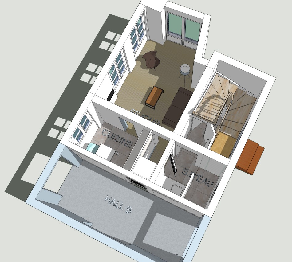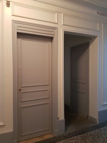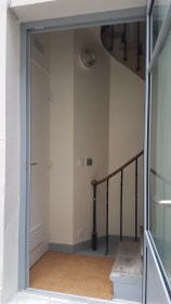 En récupérant tout espace résiduel non utilisé, la loge a acquis plus de confort. Le dessous de l’escalier et une partie des premières marches ont été annexés à la loge. Les niveaux de marche condamnés par l’emprise de la nouvelle loge ont du être récupérés et se sont matérialisés en objet de forme simple en bois non traité : le perron. Afin d’apporter un éclairage naturel au palier du rez de chaussée de cet escalier, il a été prévu une porte en bois isolante et vitrée sur les 3/4 de sa hauteur.