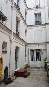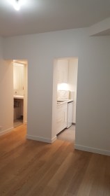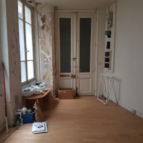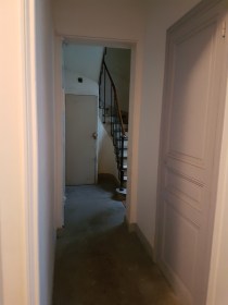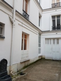 Située au rez de chaussée, elle comporte trois grandes fenêtres sur cour donnant au sud. Quoique petites, ses pièces sont agréables, bien éclairées, avec une bonne hauteur sous plafond. Le placard dans la cuisine a pris place dans l’embrasure d’un ancien passage condamné.