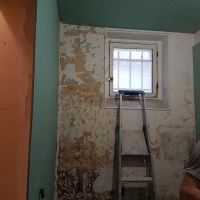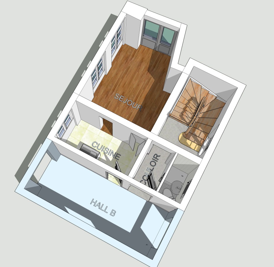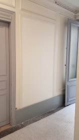 La deuxième nécessité a été, en agrandissant la loge, de la rendre confortable et habitable en cloisonnant chaque espace et en condamnant la porte d’accès au hall secondaire.