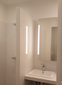 La salle d’eau intégrée grâce à l’annexion du couloir est agrandie ce qui permet d’accueillir une machine à laver en plus de sa grande douche de plein pied. Les WC sont isolés dans un recoin de la salle d’eau. Et un rangement est aménagé sous l’escalier.